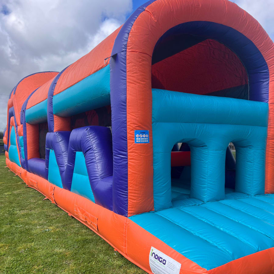 Get ready for the ultimate thrill with our 45ft purple, orange, and turquoise booster obstacle course. Designed with vibrant colours and featuring a slide and various exciting obstacles, this inflatable is perfect for a wide range of events and occasions.