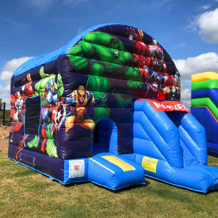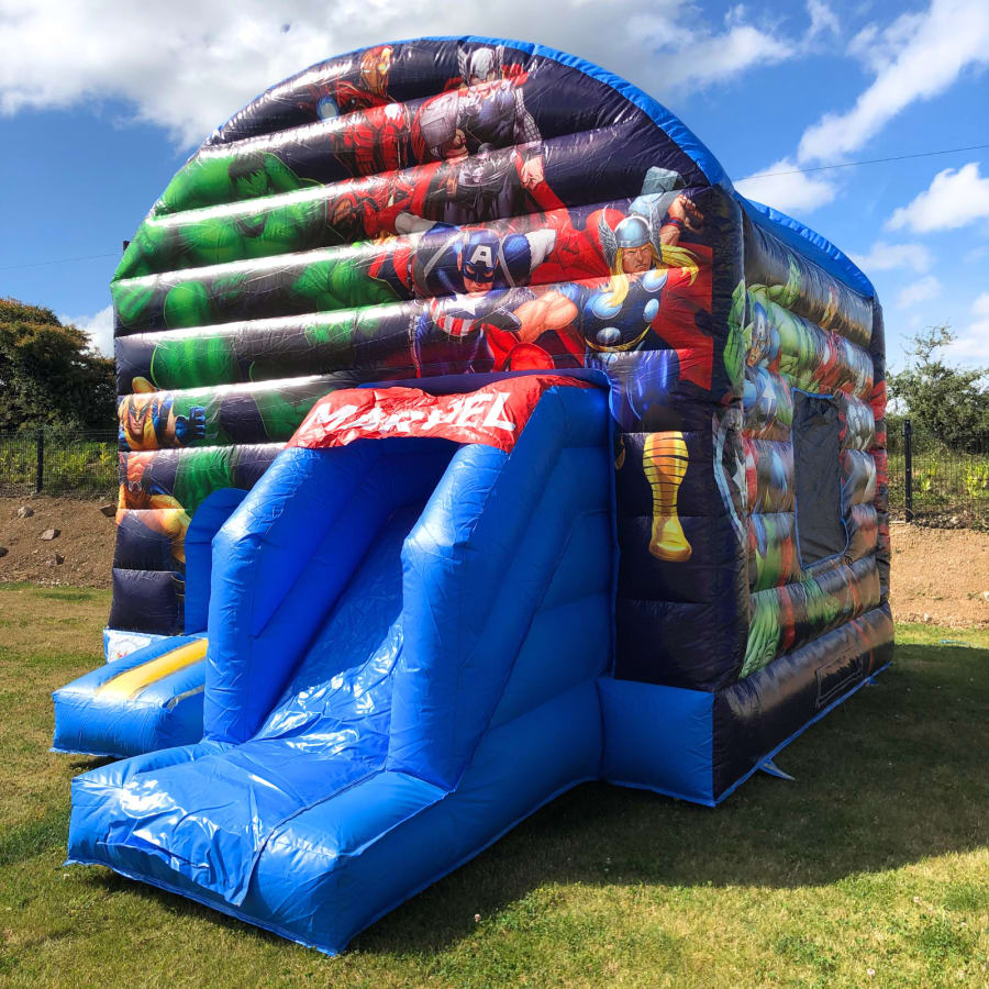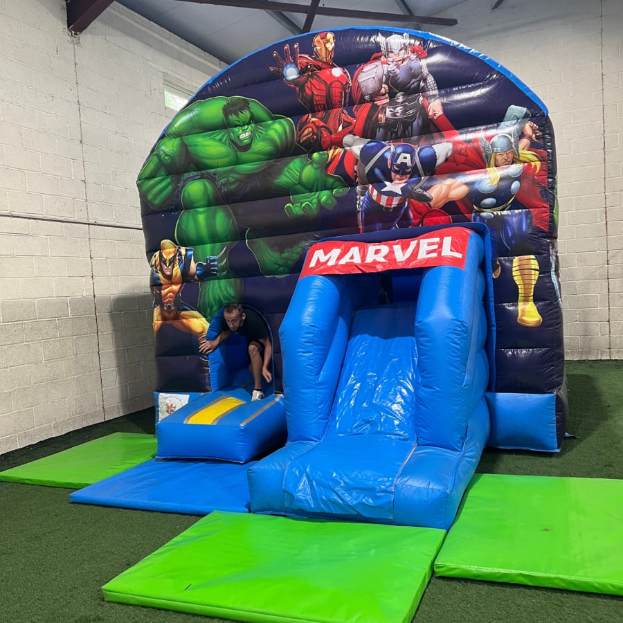 Looking to add a touch of superhero magic to your next event or celebration? Look no further than the Marvel Combi, the ultimate bouncy castle experience available for hire in Kilkenny, Waterford, Wexford, Carlow, and Tipperary. This incredible castle brings the beloved Marvel super heroes to life with its bright blue color and high-quality digital print featuring your favorite characters wrapping around the front and sides.