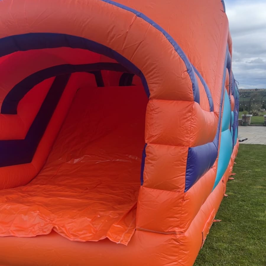 Get ready for the ultimate thrill with our 45ft purple, orange, and turquoise booster obstacle course. Designed with vibrant colours and featuring a slide and various exciting obstacles, this inflatable is perfect for a wide range of events and occasions.