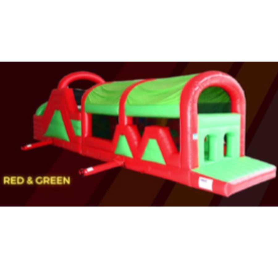 The vibrant red and green colors of the obstacle course are sure to capture everyone's attention and add a festive touch to any party. With its durable and safe design, you can rest assured that your guests will have a blast while staying protected.